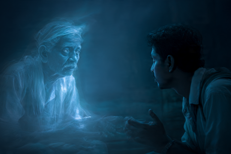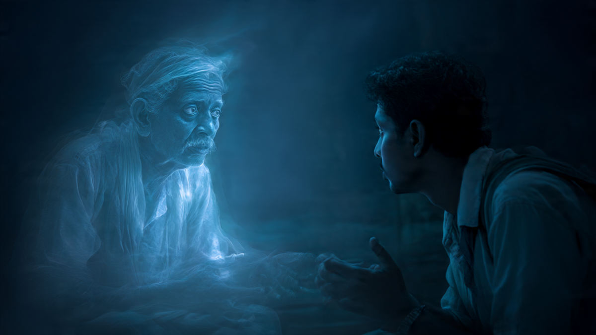 “Babu, babu? Are you alright? Please wake up, babu!” a distant voice calls, growing louder. A cold sensation touches his face—water. Soumen blinks, slowly regaining awareness. In the pale moonlight, he sees the figure crouched over him, sprinkling water onto his face.